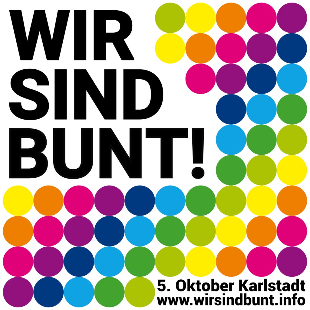 Das Karlstadter Aktionsbündnis „Wir sind bunt“ lädt jeden von uns ein, am 5. Oktober 2018, ab 18.00 Uhr gemeinsam auf dem Marktplatz ein buntes Fest der Vielfalt zu feiern. Ab 17.30 Uhr besteht bereits die Möglichkeit gemeinsam zum Marktplatz zu laufen. Treffpunkt für den Demonstrationszug zum Fest ist ab 17.00 Uhr der Fußballplatz am Baggertsweg.